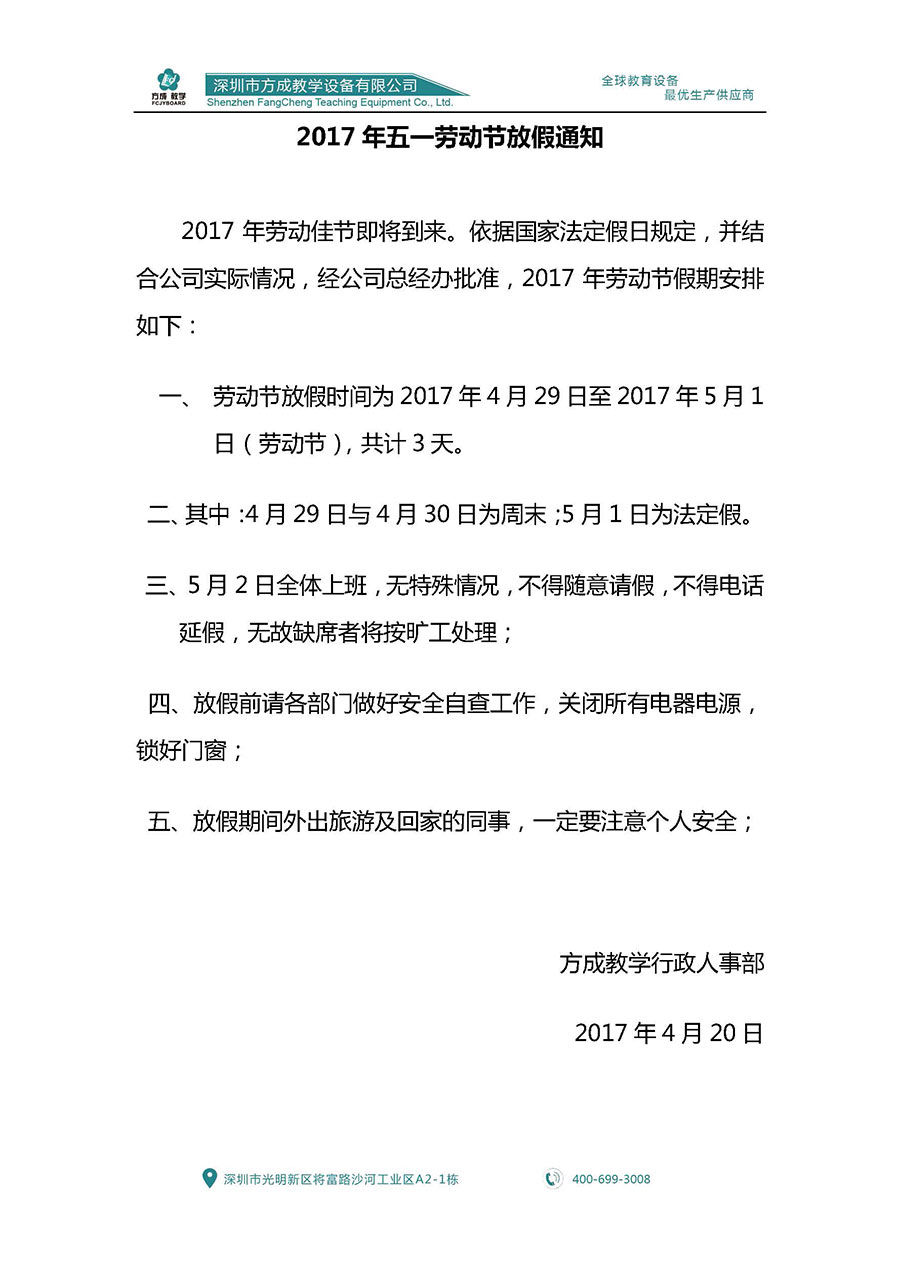 2017年勞動佳節即將到來。依據國家法定假日規定,並結合公司實際情況,經公司總經辦批準,2017年勞動節