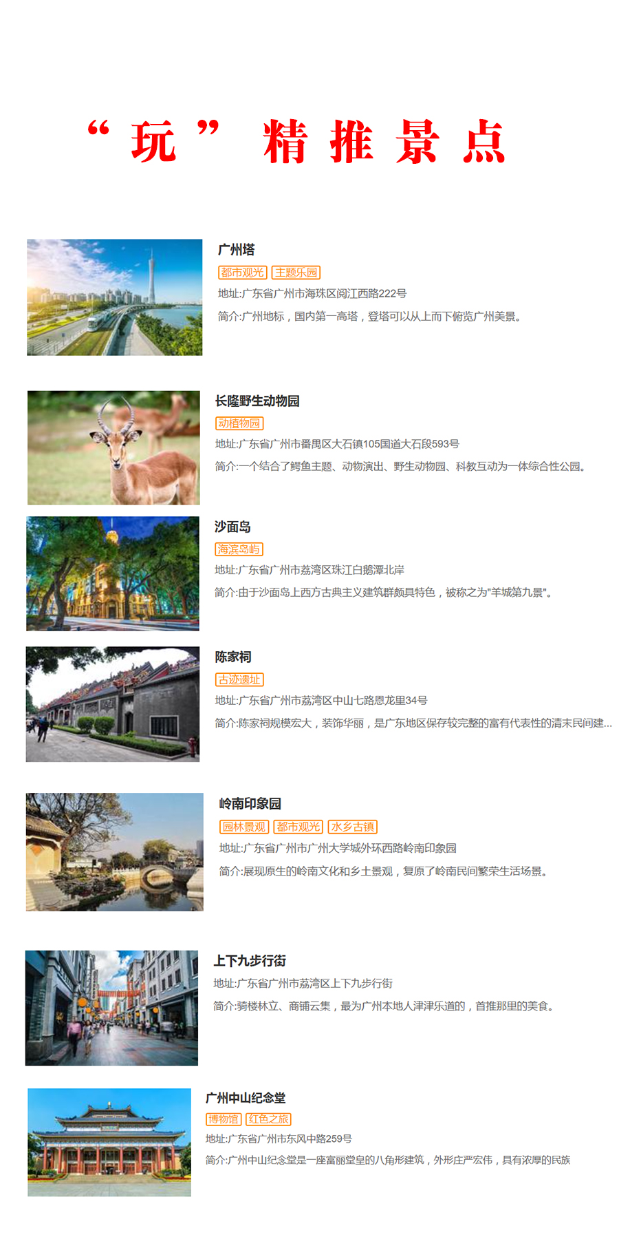 "廣州的景點怡人,以羊城新八景、花卉博覽園、花都香草世界、華南植物園等最為盛名,還有異域風情的沙麵和擁有130多年曆史的石室聖心大教堂,及陳家祠、現代化建築廣州塔和已有2100多年曆史的南越王墓都是值得一看的地方。"