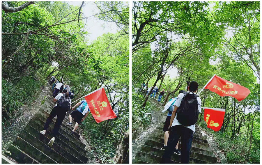 大家跟隨著團隊旗幟,整齊有序的前行。本次活動所有參與人員都登上了山頂,體現了大家的運動能力較強。